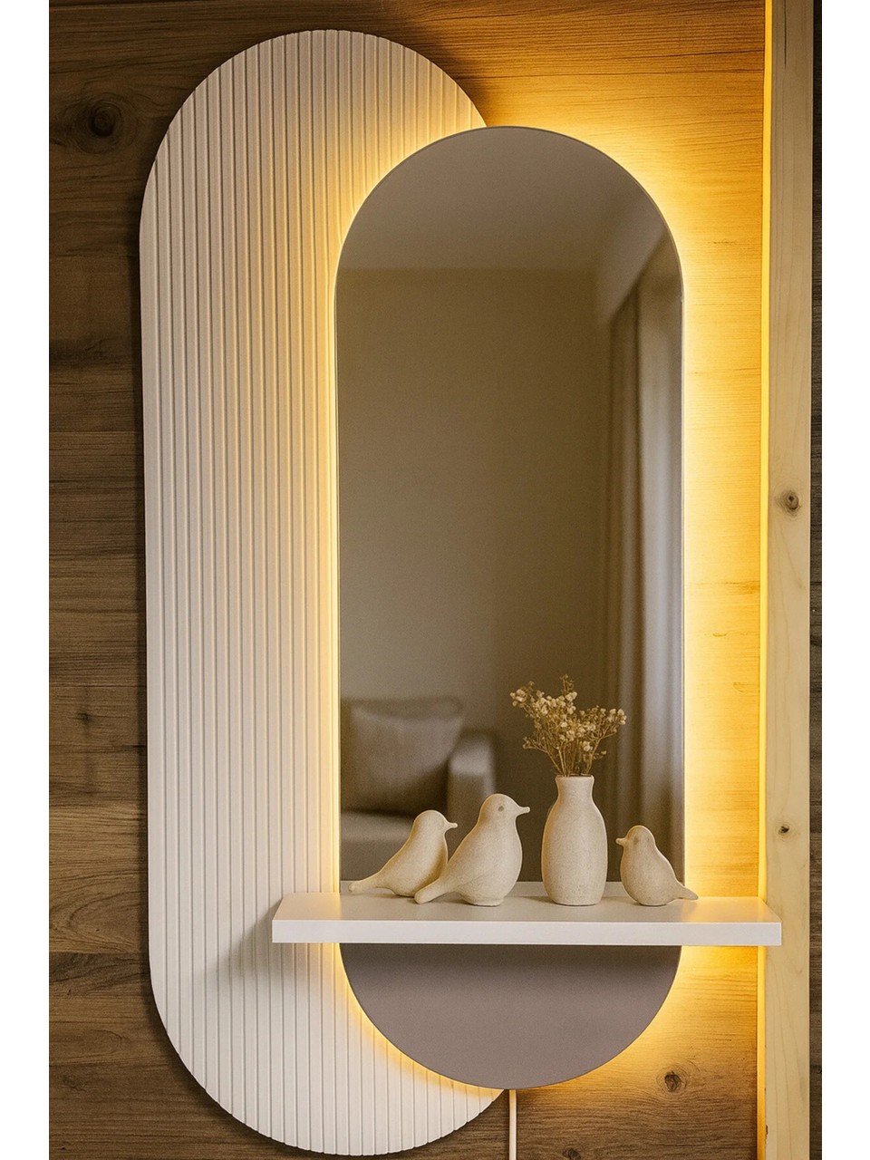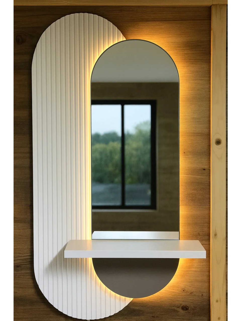 Evode Lux Aynalı LED Duvar Dekoru, modern formu ve entegre aynası ile yaşam alanlarına hem fonksiyonel hem de dekoratif bir şıklık kazandırmak için tasarlanmıştır. Raflı yapısı sayesinde dekoratif objelerinizi sergileyebilir, aynalı yüzeyi ile mekânınıza derinlik ve ferahlık katar.